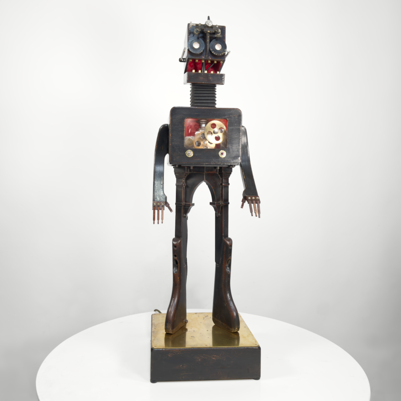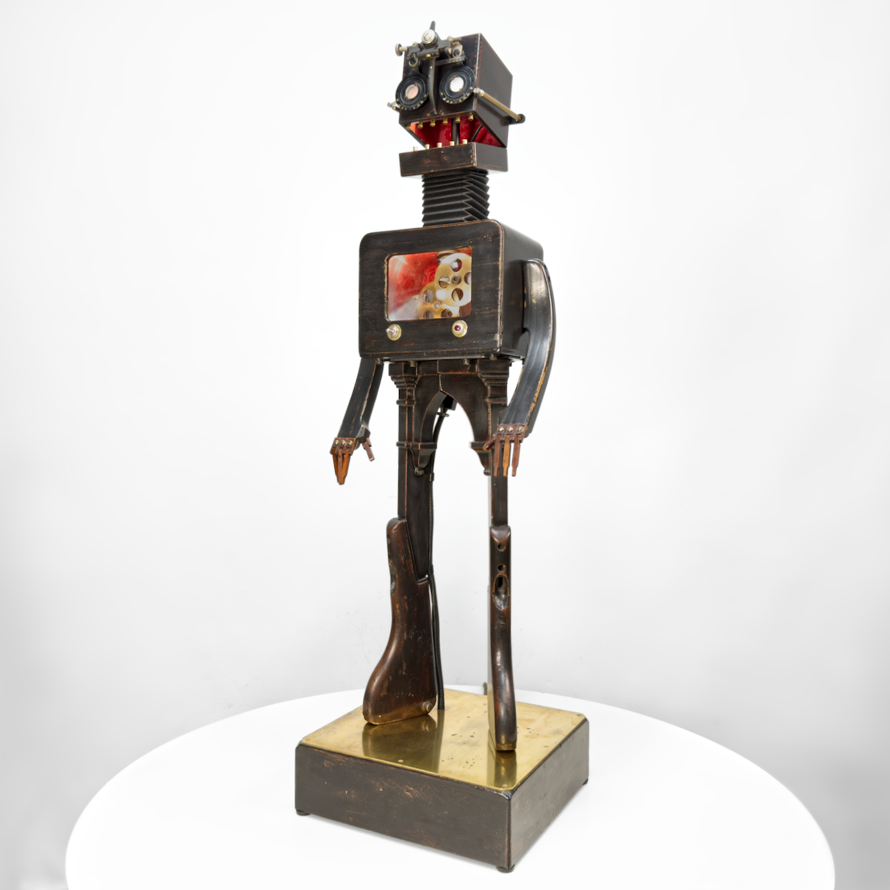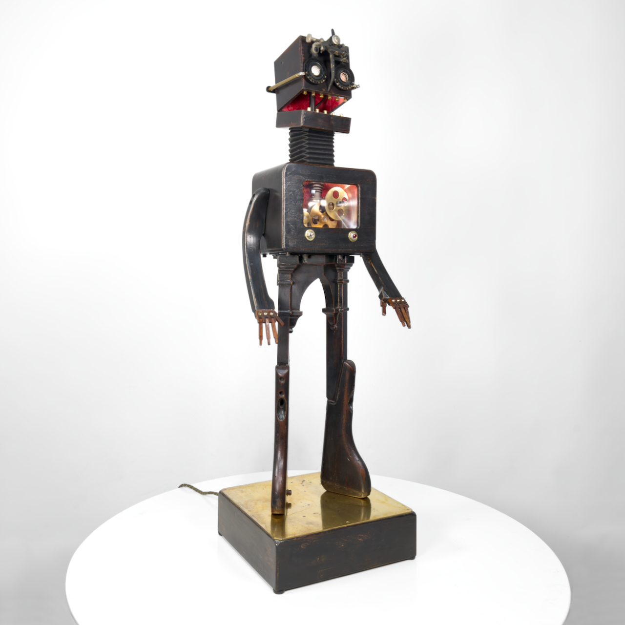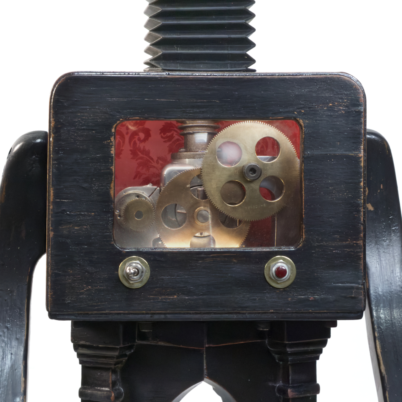 Radio, equipment case, piano legs, camera bellows, optometrists equipment, rocking chair arms, gun stocks, .22 shell casings, compressor cylinder, gears, wallpaper, brass, aluminum, LEDs, motor.