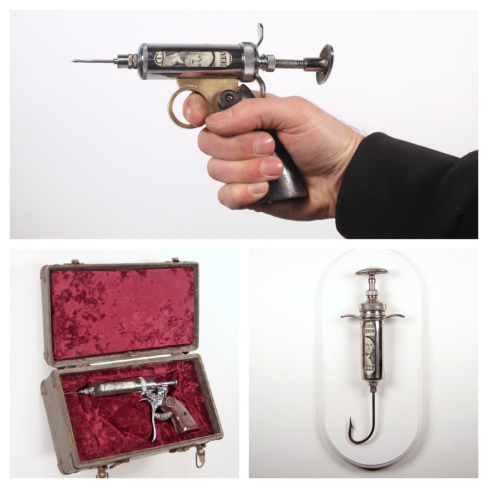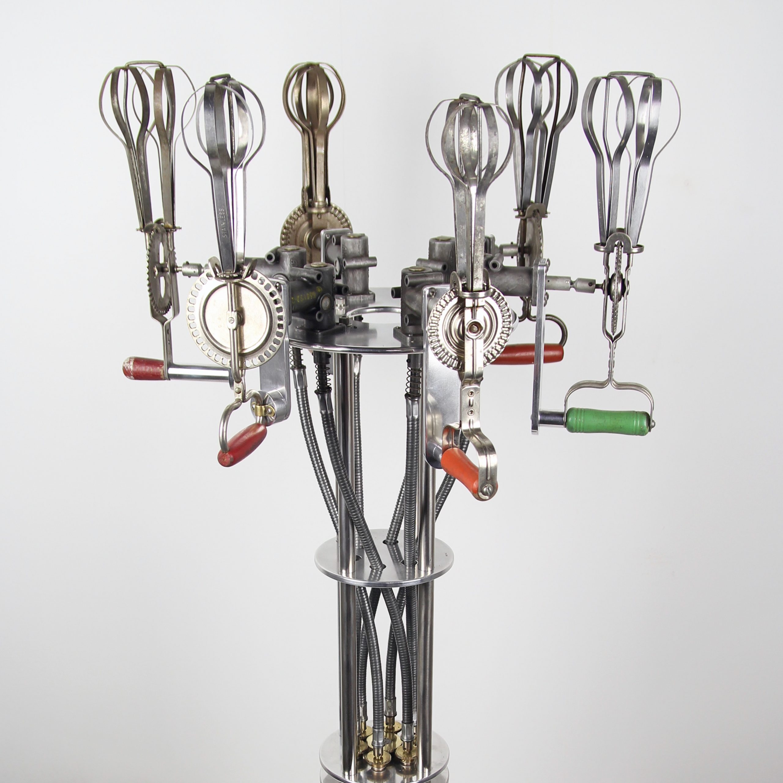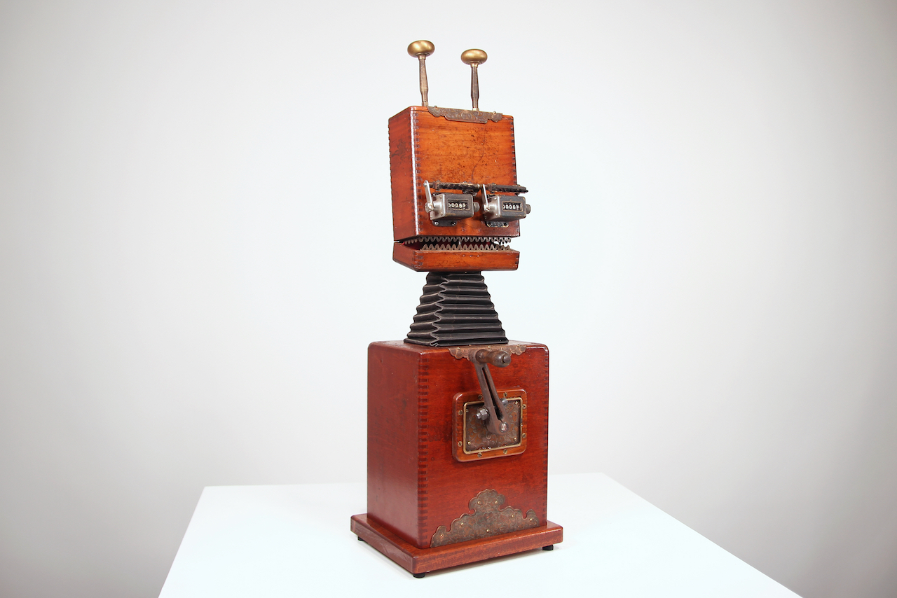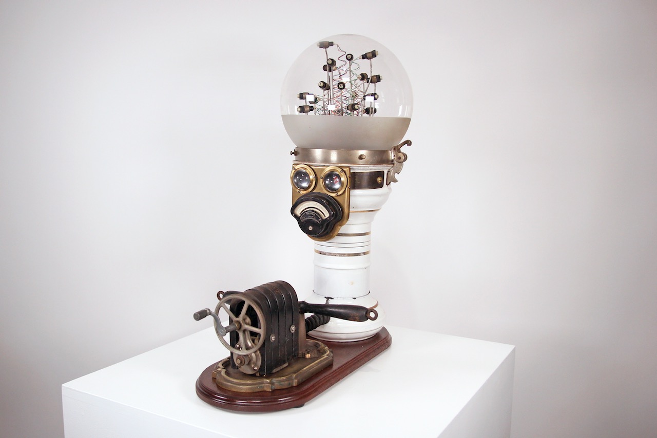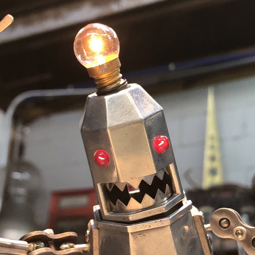 “Megalodon” is the ultimate apex predator. Emulating the elaborate action-figure play-sets of my youth, this piece appears to be a Shark from a distance. Closer inspection reveals it to be a vessel, part submarine, part spaceship, teeming with the activity of its crew working at their respective tasks. This project began as a salvaged wing fuel tank from a F-94 bomber plane, and thousands of other lovingly hoarded, and hand crafted objects. The final effect is of a “Grand Miniature”. The viewer is both dwarfed, and empowered in its presence. Please watch the video above for a more full experience.