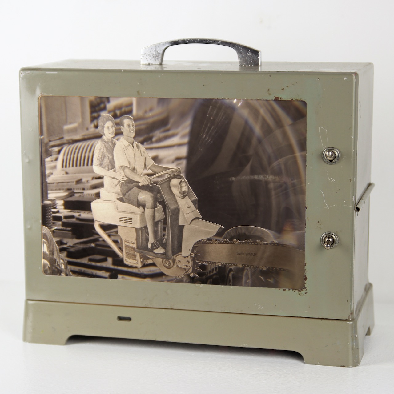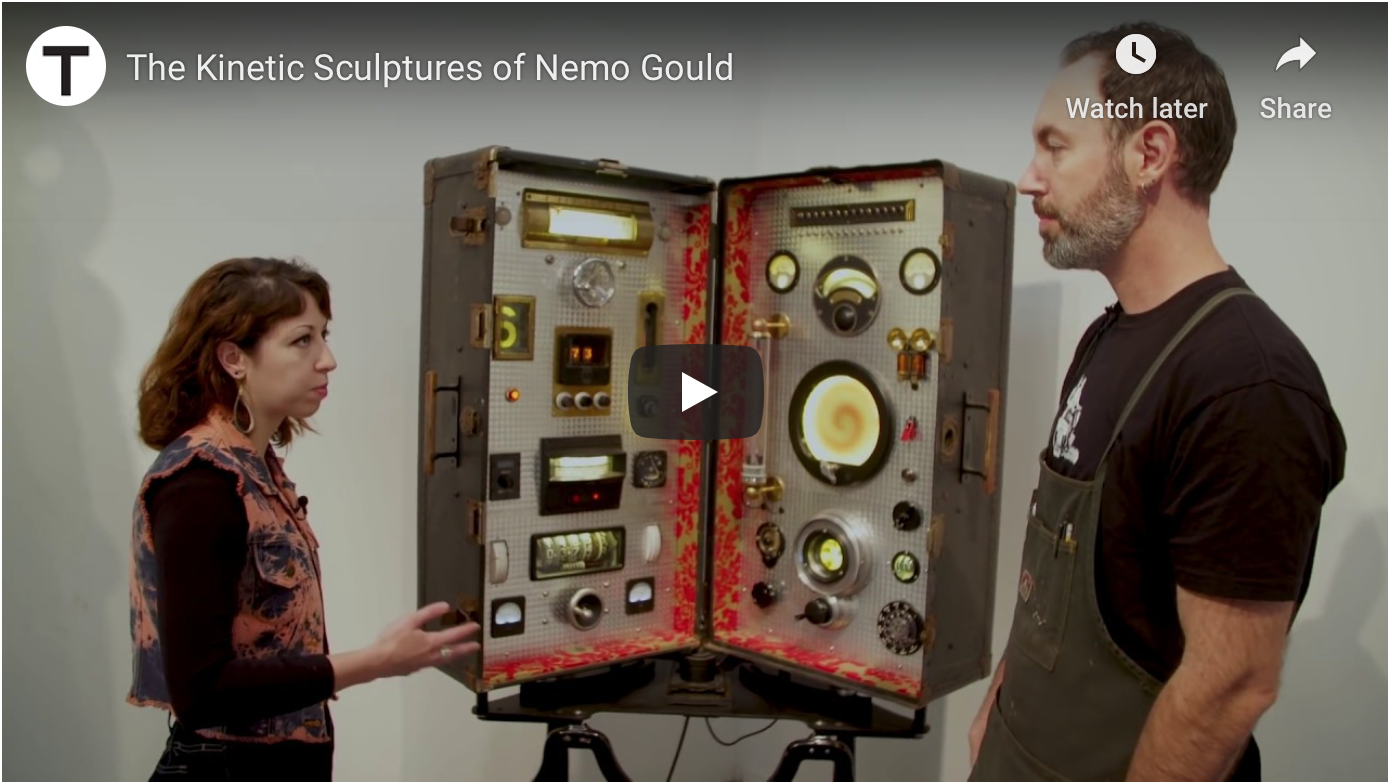 Self-described “Chairman of the Hoard” Nemo Gould is a master accumulator, of both materials and building techniques alike. His Oakland studio is a veritable museum of old objects and technology which he blends into his signature style of kinetic sculpture. His work pushes the limits of found object art and challenges the viewer to experience art through interaction and experience. Gould received his BFA from the Kansas City Art Institute in 1998, and his MFA in sculpture from U.C. Berkeley in 2000. His work is featured in museums and collections throughout the U.S. and abroad.