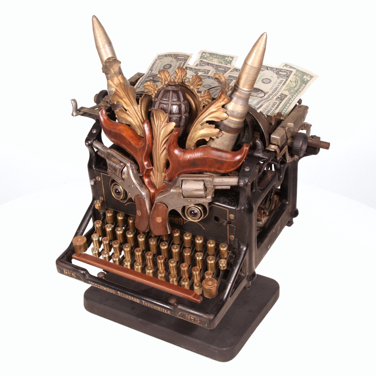 Typewriter, pistols, bullet casings, practice ammunition, hand grenade, clock motor, saw handle, chandelier parts, dollar bills, optometrist device stand, aluminum, steel, wood.